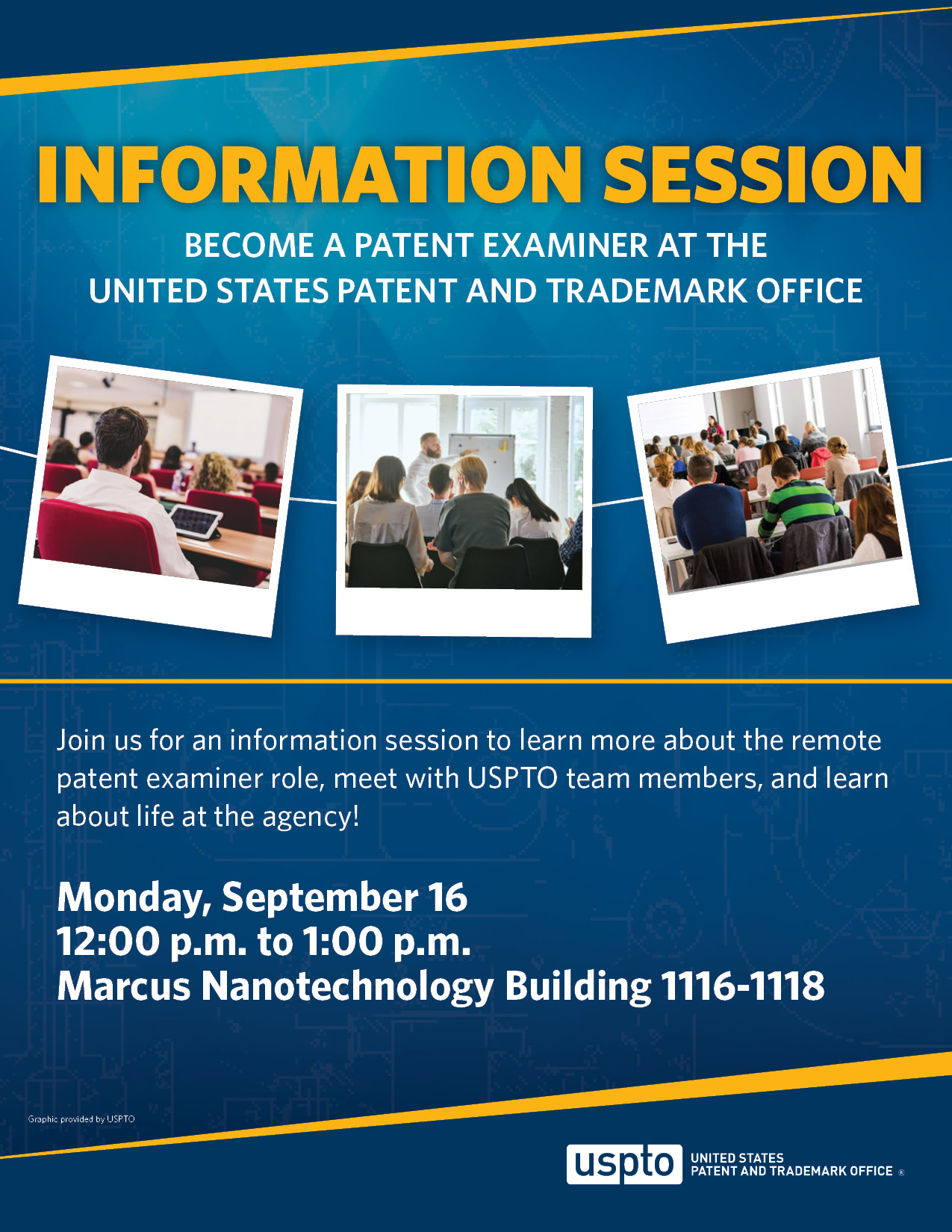 Join the BME Department and The United States Patent and Trademark Office (USPTO) for an information session to learn more about the remote patent examiner role, meet with USPTO team members, and learn about life at the agency. Students will also hear from the career journeys of two supervisory patent examiners and will also be able to ask questions they may have about what a career as a patent examiner looks like. USPTO is looking for the following majors (or similar majors): Biology, Biomedical Engineering, Chemistry, Chemical Engineering, Computer Engineering, Computer Science, Electrical Engineering, Mechanical Engineering, and Physics.