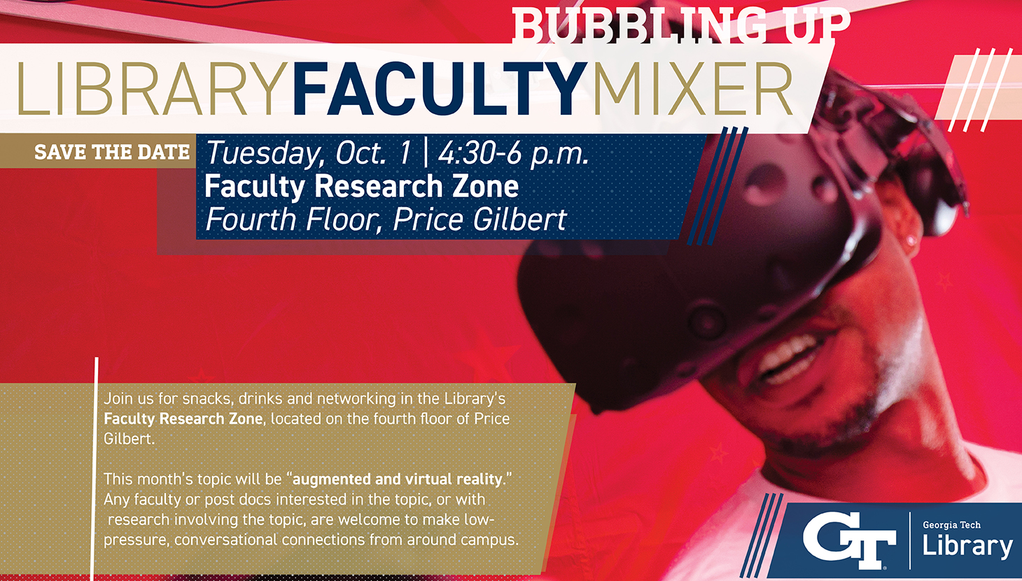 Join the Georgia Tech Library Tuesday, Oct. 1 from 4:30 - 6 p.m. for our “Bubbling Up” faculty mixer, held in Price Gilbert’s fourth floor Faculty Research Zone. This month’s topic is AR/VR.