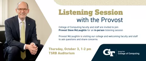 Listening Session with the Provost Thursday October 3, 2024 1:00PM - 2:00PM Contact Information tonya.peoples@cc.gatech.edu Location TSRB Auditorium Event time Thu, 10/03/2024 - 13:00 - Thu, 10/03/2024 - 14:00 Listening Session with the Provost College of Computing faculty and staff are invited to join Provost Steve McLaughlin for an in-person listening sessionProvost McLaughlin is visiting our college and welcoming faculty and staff to ask questions and share concerns