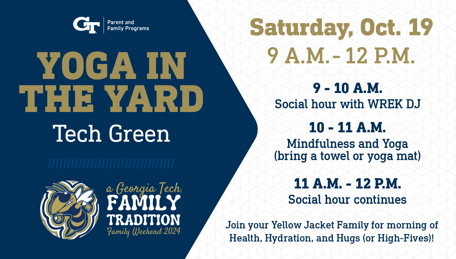 We know not every parent can make the trip to Georgia Tech for Family Weekend, and we want all students to celebrate their GT family during Family Weekend 2024. Come out to Tech Green and enjoy a WREK DJ from 9 – 10 a.m., Yoga and Meditation from 10 – 11 a.m., and close out the morning when the DJ comes back after the class for another set!