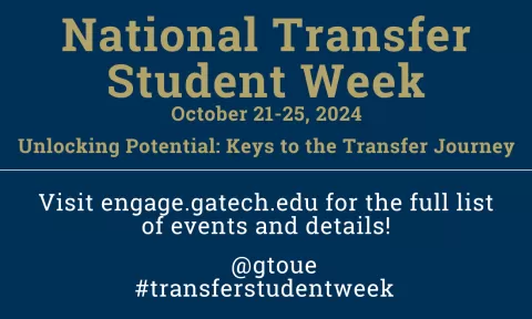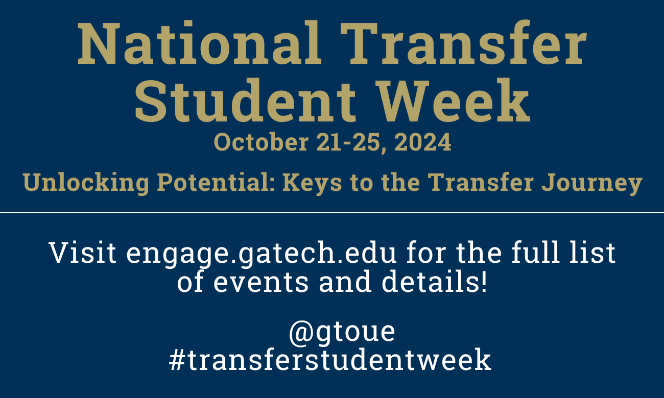 National Transfer Student Week Main Celebration Wednesday October 23, 2024 6:00PM - 8:00PM Contact Information transfersuccess@gatech.edu Location Marcus Nanotechnology Building, Conference Rooms (1116-1118) Event time Wed, 10/23/2024 - 18:00 - Wed, 10/23/2024 - 20:00 National Transfer Student Week Main Celebration Join fellow transfer students as we celebrate YOU!!! We will have food, games, and giveaways for attendees as you socialize with one another. Related Link Engage Event Page