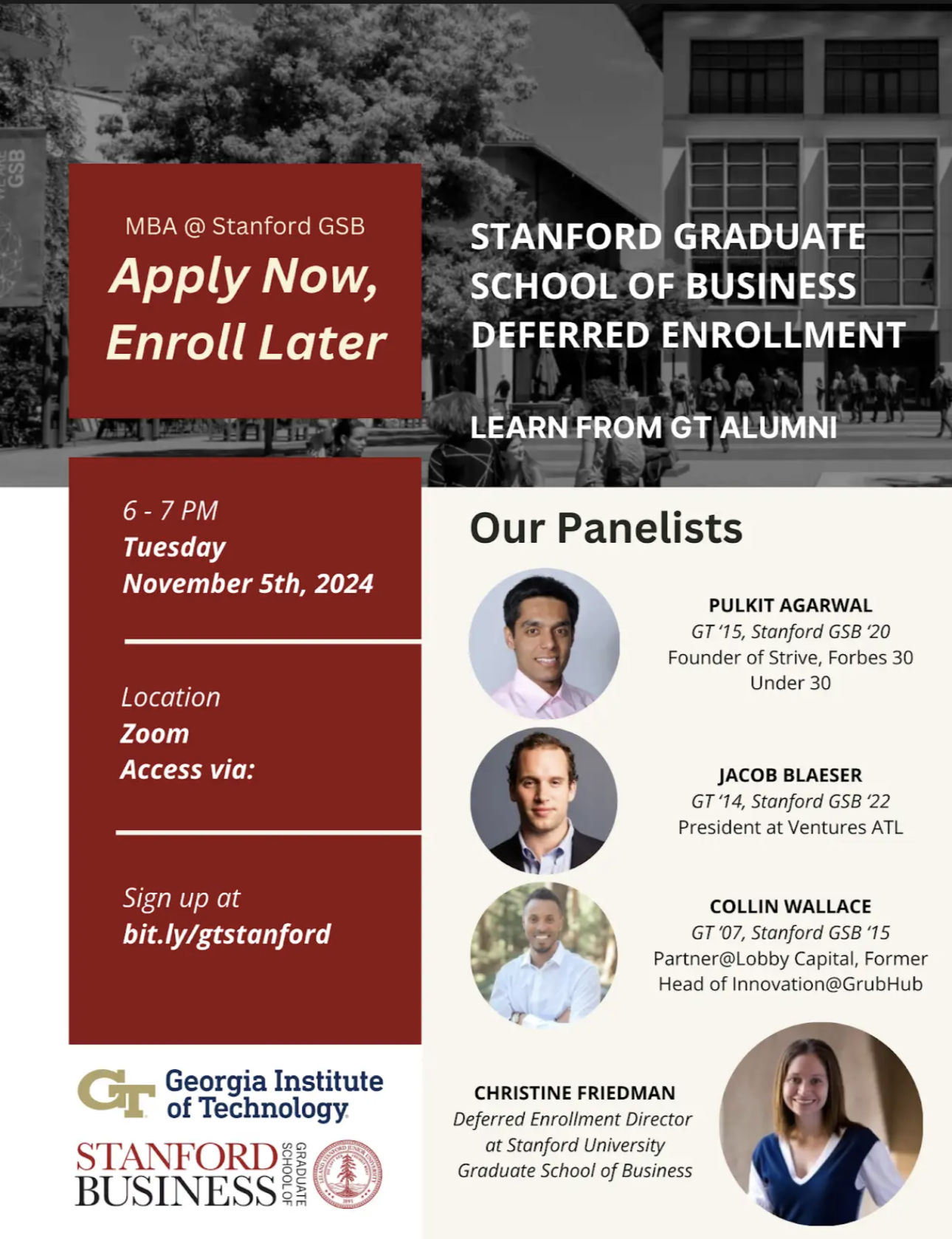 We are hosting a Stanford GSB + GT alumni panel with the Deferred Enrollment Director at Stanford, Christine Friedman! This is a unique opportunity to learn more about deferred enrollment, Stanford GSB MBA, and whether this path is for you! We will have accomplished panelists, who are alumni from both Georgia Tech and Stanford, discussing their journey and perspective on the Stanford GSB MBA.
