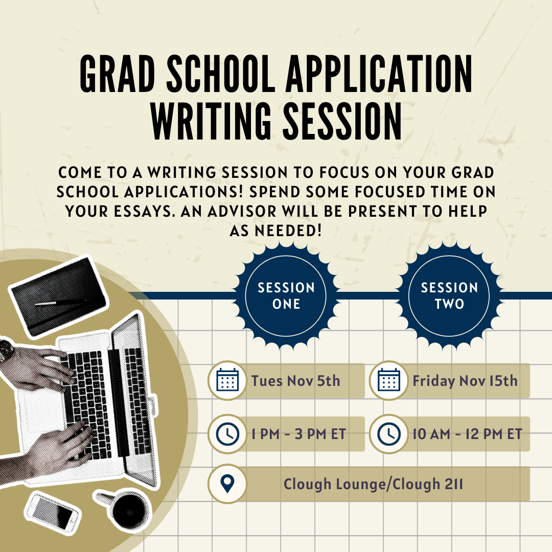 Grad School Application Writing Session Tuesday November 5, 2024 1:00PM - 3:00PM Contact Information Susan Belmonte, sbelmonte@gatech.edu Location Clough Lounge/Clough 211 Event time Tue, 11/05/2024 - 13:00 - Tue, 11/05/2024 - 15:00 Grad School Application Writing Session Come to a writing session to focus on your grad school applications! Spend some focused time on your essays. An advisor will be present to help as needed! Come when you can. Leave when you want.