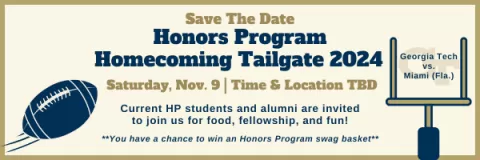 Both current Honors Program students and alumni, as well as their families, are invited for food, fellowship, and fun as we tailgate for the Georgia Tech vs. Miami (Fla.) Homecoming Game held Saturday, November 9th.
