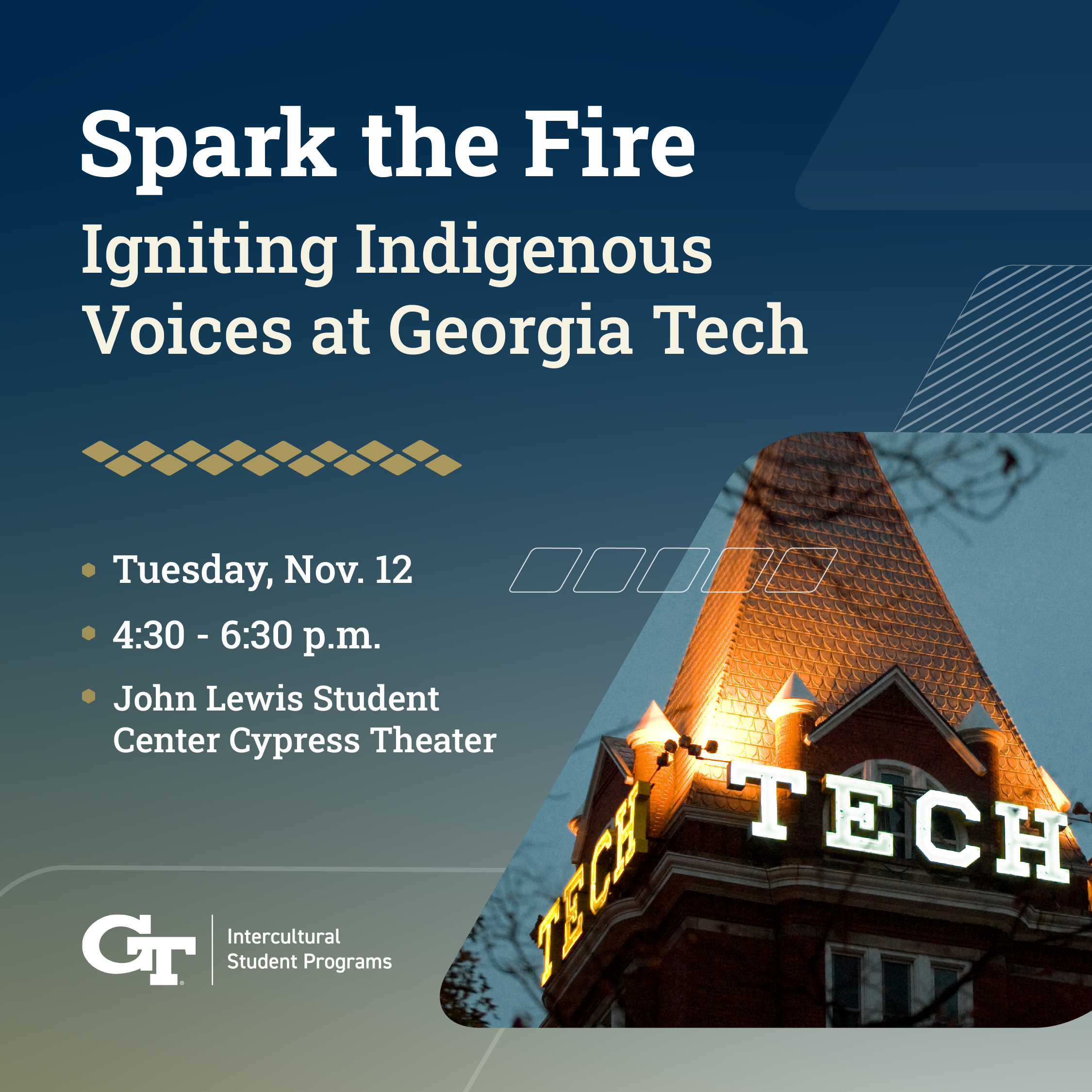 Join Intercultural Student Programs (ISP) for a forum in celebration of Native American Heritage Month on Nov. 12 from 4:30-6:30 p.m. in the Cypress Theater (John Lewis Student Center). Together, ISP and the campus community will explore impactful ways to uplift and support Indigenous communities locally and globally, sparking conversations to pave the way for future initiatives at Georgia Tech. All GT students, faculty, and staff are welcome to attend. If interested in attending, RSVP today!