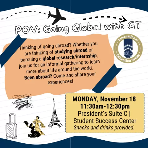 This casual mixer-style event invites prospective students and past participants of international opportunities (study abroad, internship, etc.) to come and discuss life/experiences abroad. It is a great opportunity not only for prospective students to learn about the different international opportunities offered at Tech, but it is also a valuable opportunity for past participants to share their experiences and reflect on the things they have gained from abroad. Attendees will be split into different regions. Note cards with conversation topics are prepared in case attendees do not have questions.
