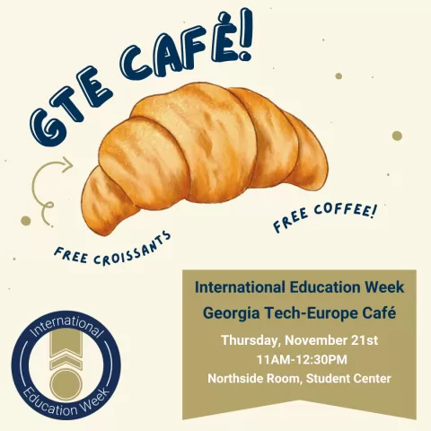 In honor of International Education Week, Georgia Tech-Europe will host a "Café" serving up free coffee and croissants to all past and prospective GTE students! GTE Alumni: come and catch up with friends and reminisce about your semester in Metz! Prospective Students: come meet GTE alumni and staff and get all of your GTE questions answered!