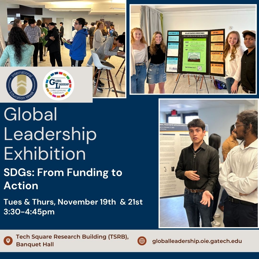 In this poster exhibition of ideas and innovation, Global Leadership students will share their project proposals to advance SDGs around the world. Throughout their first semester at Georgia Tech, Global Leadership students worked in small groups to develop an idea that will advance at least one SDG and design a proposal for field testing in locations around the world while taking into account local communities' needs and cultures. Each afternoon half of the Global Leadership will present their work via poster and questions and answers with guests.