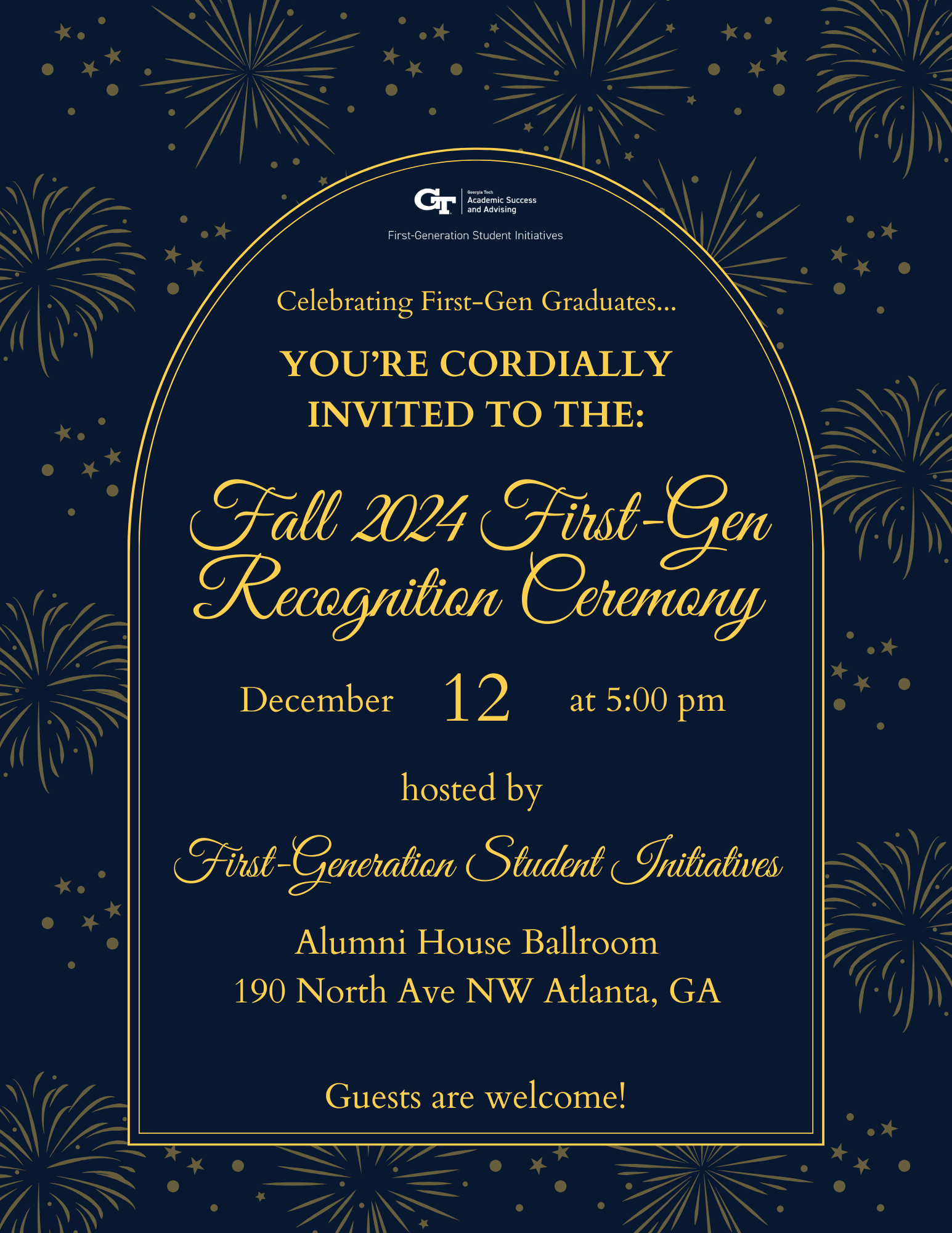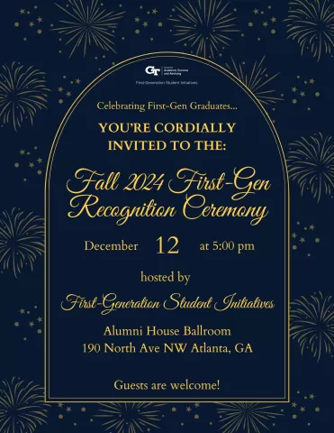 Fall 2024 First-Gen Recognition Ceremony Thursday December 12, 2024 5:00PM - 7:00PM Contact Information Dr. Charmaine Troy - charmaine.troy@gatech.edu Location Alumni House Ballroom Event time Thu, 12/12/2024 - 17:00 - Thu, 12/12/2024 - 19:00 Fall 2024 First-Gen Recognition Ceremony Join the First-Generation Student Initiatives in honoring the Georgia Tech's Fall 2024 First-Generation Graduates. Guests are welcome! Related Link FGSI on Engage