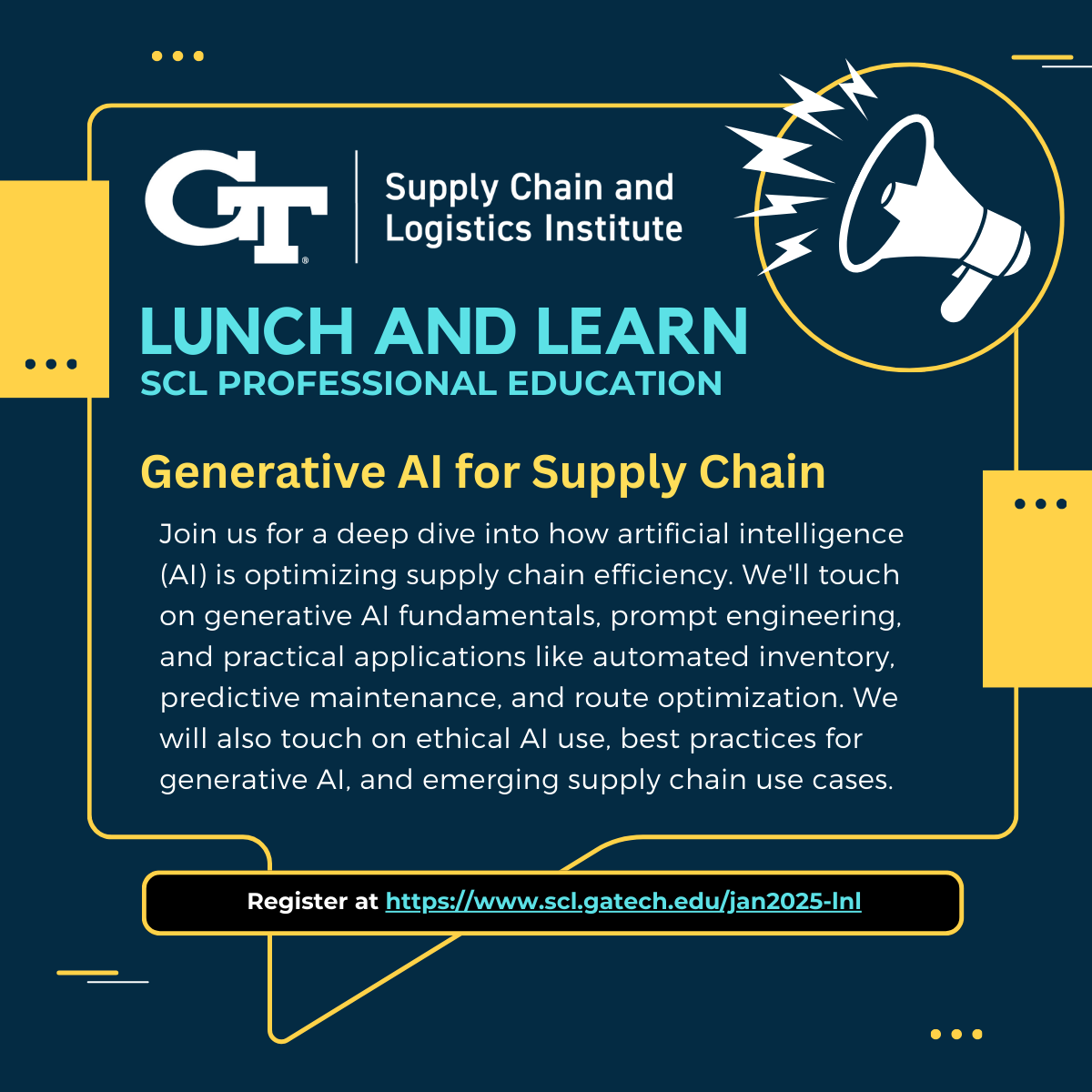 We'll touch on generative AI fundamentals, prompt engineering, and practical applications like automated inventory, predictive maintenance, and route optimization. We will also touch on ethical AI use, best practices for generative AI, and emerging supply chain use cases.
