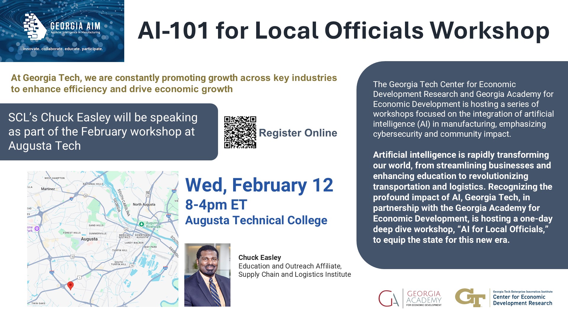The workshop is made possible through funding from Georgia Artificial Intelligence in Manufacturing (Georgia AIM). Chuck Easley with the Georgia Tech Supply Chain and Logistics Institute (SCL) and Georgia AIM will be one of the speakers.