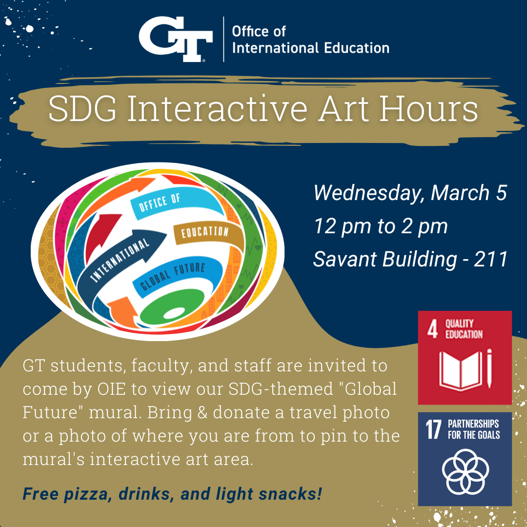 Georgia Tech students, faculty, and staff are welcome to come by OIE between 12 pm and 2 pm on Wednesday, March 5 to view our impressive "Global Future" mural, an SDG-themed work of art designed and painted by Vera Zeigler with the help and inspiration of our very own Georgia Tech students and employees.