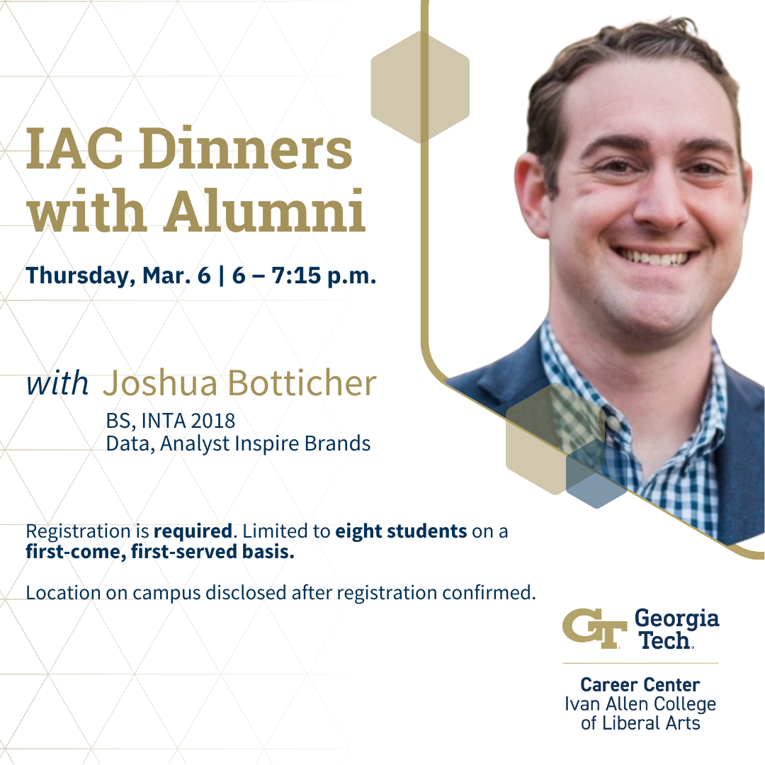 Join us for an exclusive installment of the Ivan Allen College Dinners with Alumni event series! Enjoy an engaging dinner with Joshua Botticher, INTA 2018 and data analyst at Inspire Brands, at a location on campus to be disclosed upon registration confirmation.