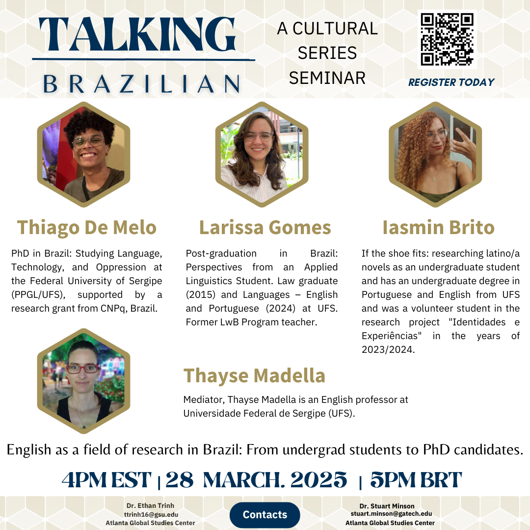 English as a field of research in Brazil: From undergrad students to PhD candidates Friday March 28, 2025 4:00PM - 5:00PM Location Event time Fri, 03/28/2025 - 16:00 - Fri, 03/28/2025 - 17:00 English as a field of research in Brazil: From undergrad students to PhD candidates Talking Brazilian: A Cultural Seminar SeriesFriday, March 28, 2025 | 4pm EST / 5pm BRT | online via Zoom Related Link Register Here