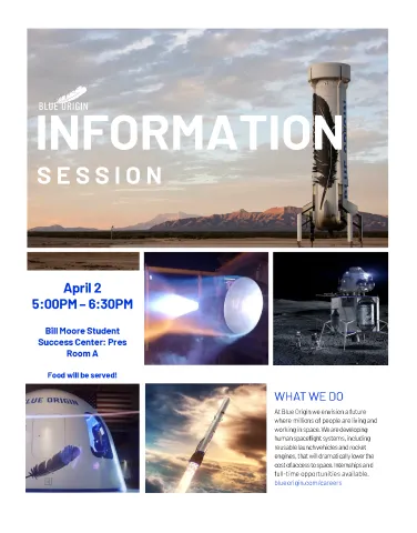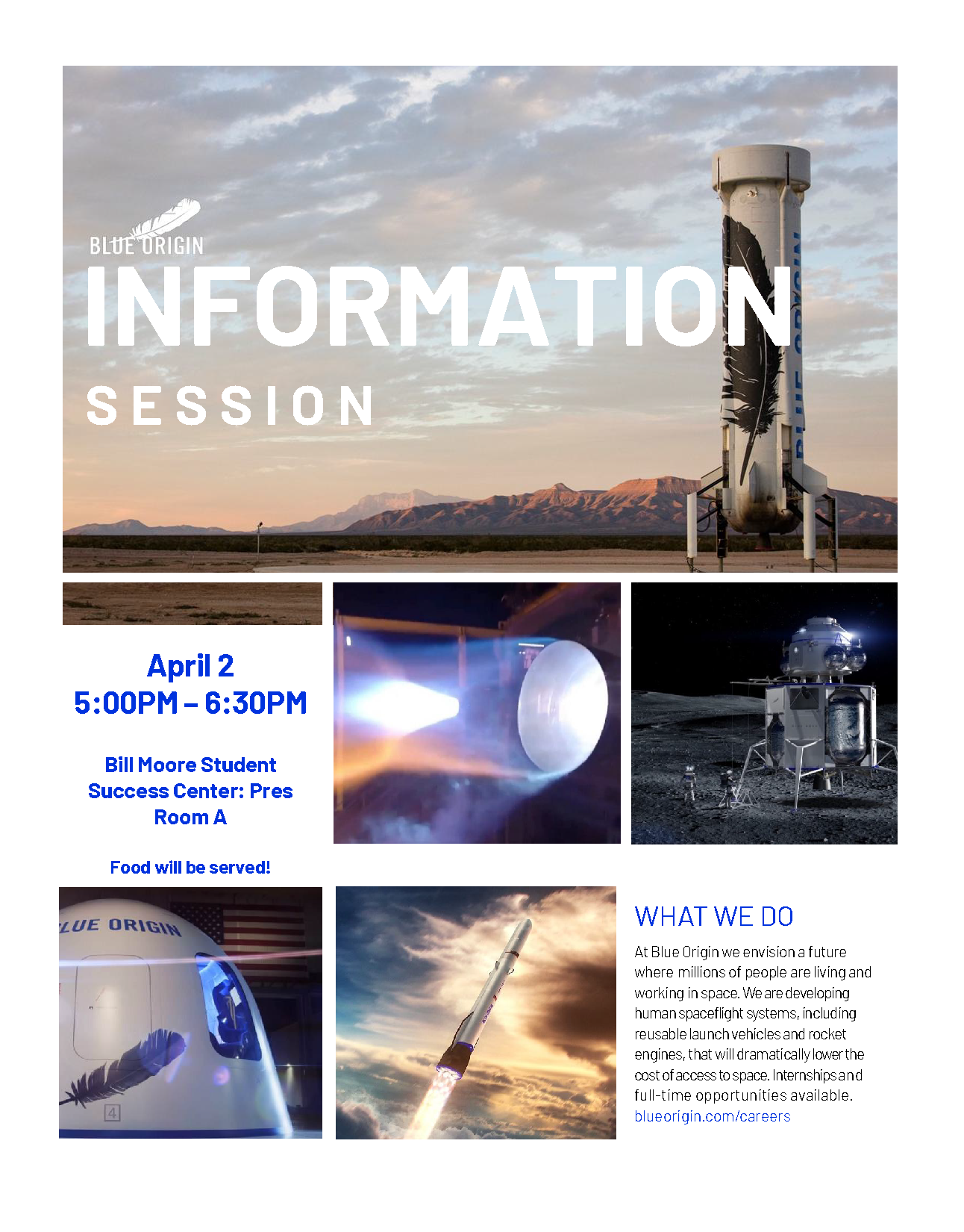 Blue Origin is thrilled to invite you to an upcoming Information Session where you can learn about exciting full-time opportunities tailored for soon-to-be graduates (both Spring and Fall 2025). We will also discuss our Spring 2026 Internship Program. Pizza will be provided!