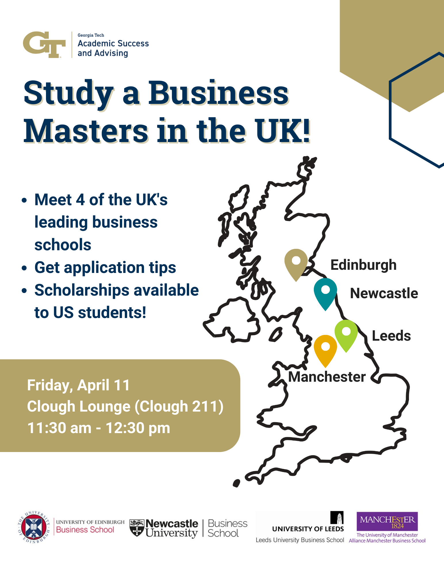 Business Masters Programs in the UK info session Friday April 11, 2025 11:30AM - 12:30PM Contact Information Graham RichmondSouthwark Consulting+1 (215) 568-2590 (USA)graham@southwarkconsulting.comSusan Belmonte, PhDAssoicate Director, Pre-Graduate Advising & Special Advising InitiativesGeorgia Techsbelmonte@gatech.edu Location Clough Lounge/Clough 211 Event time Fri, 04/11/2025 - 11:30 - Fri, 04/11/2025 - 12:30 Business Masters Programs in the UK info session Study a Business Masters in the UK! Meet four of the UK's leading business schools: University of Edinburgh, University of Leeds, Manchester University, and Newcastle UniversityGet application tips!Scholarships available to US students. Event Category Career/Professional development Invited Audiences Public Graduate students Undergraduate students