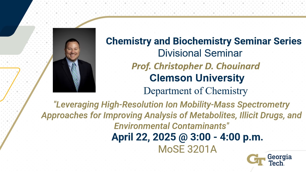Bio: Dr. Christopher Chouinard is an Assistant Professor in the Department of Chemistry at Clemson University. He received his Ph.D. working under Rick Yost at University of Florida. During his graduate studies, he responsible for integrating drift tube-ion mobility spectrometry (DTIMS) into the Yost lab. Chris’s interests at UF involved IM-MS studies of clinical molecules (steroids, Vitamin D metabolites) and improved identification of anabolic androgenic steroids in athletes. After graduating from UF, Chris held a prestigious post-doctoral position at Pacific Northwest National Laboratory (PNNL) in Richland, WA. While working with Dick Smith, Chris designed and developed a Structures for Lossless Ion Manipulations (SLIM) platform that enabled the first integration of LC into the SLIM IM-MS pipeline for improved analysis in phosphoproteomics. After four years at Florida Tech, Chris joined the faculty at Clemson in 2022. Project in his group broadly involve IM-MS instrument development, fundamentals of ionization and gas-phase structure, and applications toward illicit drugs, biomolecules, and environmental contaminants. He currently holds joint affiliations in the Eukaryotic Pathogens Innovation Center (EPIC), Clemson University School of Health Research (CUSHR), and the Robert H. Brooks Sports Science Institute.