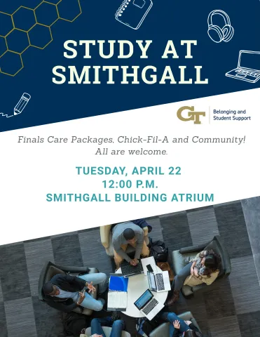 Join Belonging and Student Support for a Smithgall Building finals kickoff on Tuesday, April 22 at 12:00 p.m. in the Atrium. There will be Chick-Fil-A, finals care packages, pomodoro studying, and a supportive community to help you fuel up for and power through finals.