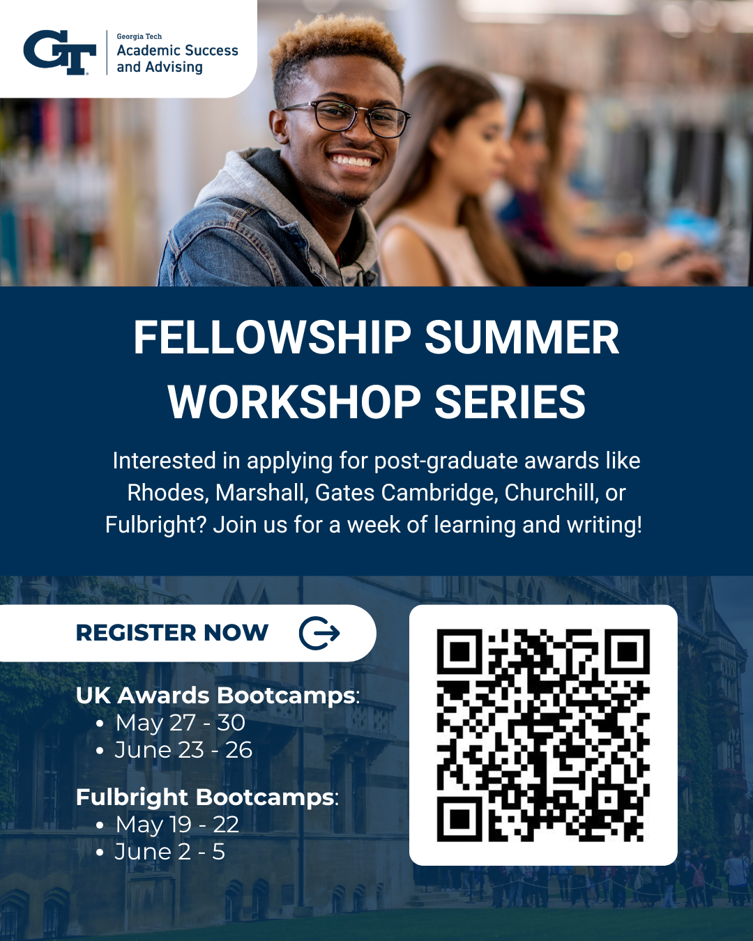 Fellowship Summer Workshop Series - UK Awards Bootcamps Monday June 23, 2025 6:00PM - 7:00PM Location Related Link Directions Event time Mon, 06/23/2025 - 18:00 - Mon, 06/23/2025 - 19:00 Fellowship Summer Workshop Series - UK Awards Bootcamps Interested in applying for post-graduate awards like Rhodes, Marshall, Gates Cambridge, Churchill, or Fulbright? Join us for a week of learning and writing! Event Category Career/Professional development Invited Audience Undergraduate students