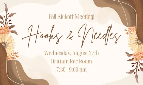 GT Hooks & Needles First Fall Meeting Wednesday August 27, 2025 7:30PM - 9:00PM Contact Information Nikita Takalkar Location Rec Room, Brittain Dining Hall Event time Wed, 08/27/2025 - 19:30 - Wed, 08/27/2025 - 21:00 GT Hooks & Needles First Fall Meeting Join us in Georgia Tech's knitting and crochet club's first meeting of the semester! Join our community of crafty people on campus, and spend some time relaxing and unwinding with crafts and music! Event Category Arts and Performance Invited Audiences Faculty/Staff Graduate students Undergraduate students