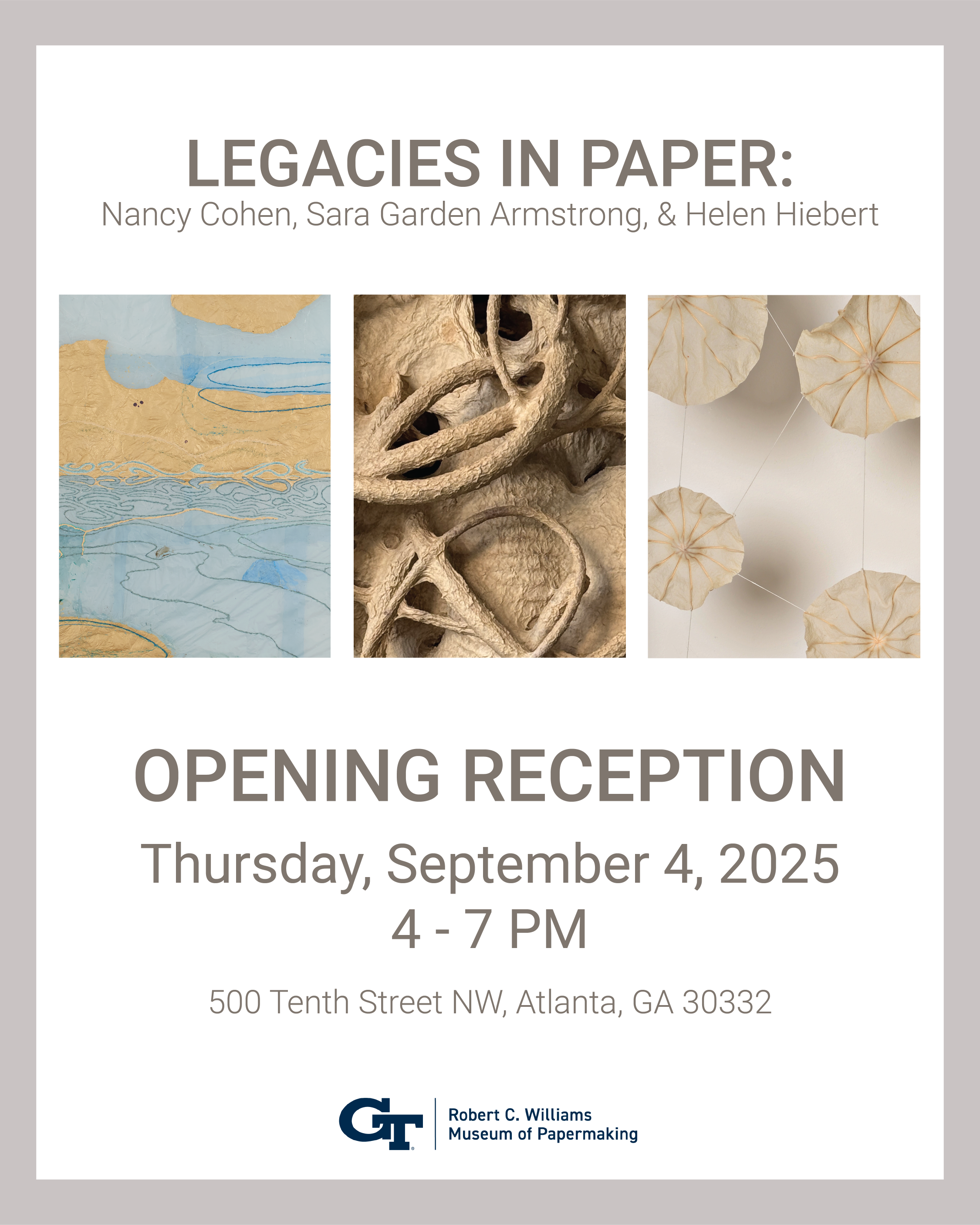 Please join us in celebrating the Legacies In Paper exhibit at the Robert C. Williams Museum of Papermaking. The artists featured in the inaugural triennial series Legacies in Paper, Nancy Cohen, Sara Garden Armstrong, & Helen Hiebert have spent a lifetime exploring the boundless qualities of handmade paper. This exhibit dives into what it means for an artist to spend years exploring a material, and how deep an understanding and visual vocabulary can be created with time and an extensive investigation. The artists will be present for the reception. Free and open to the public.