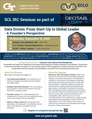 Additional speakers include: Mike Branch (Geotab VP of Data & Analytics), John Ballantyne (Geotab VP of Research and Innovation), Samuel Harris (GDOT Asst State Traffic Engineer), Benoit Montreuil (SCL Executive Director), Yichang (James) Tsai (Prof, Civil and Environmental Engr), Sofia Perez-Guzman (Asst Prof, Civil and Environmental Engr), Chris Gaffney (SCL Managing Director)