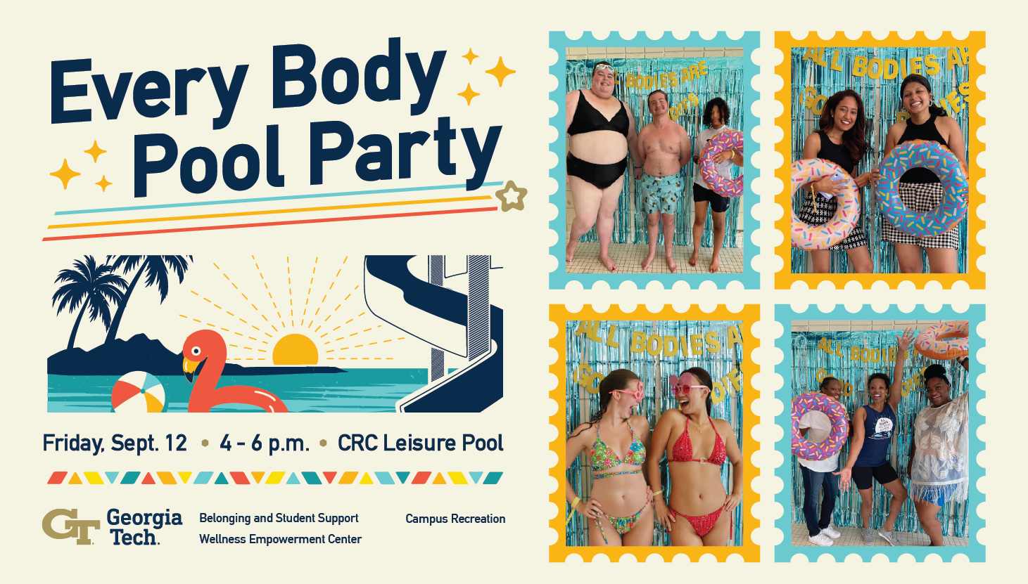 Make a splash at this year's Every Body Pool Party on Friday Sept. 12 from 4-6 p.m. in the Campus Recreation Center Leisure Pool. This event is focused on celebrating all bodies and promoting body positivity, community, and fun! Connect with other students while you enjoy a swim, check out the water slide, relax in the spa, or play games. This is one pool party you don't want to miss! This event is sponsored by Wellness Empowerment Center, Belonging and Student Support, and Campus Recreation.