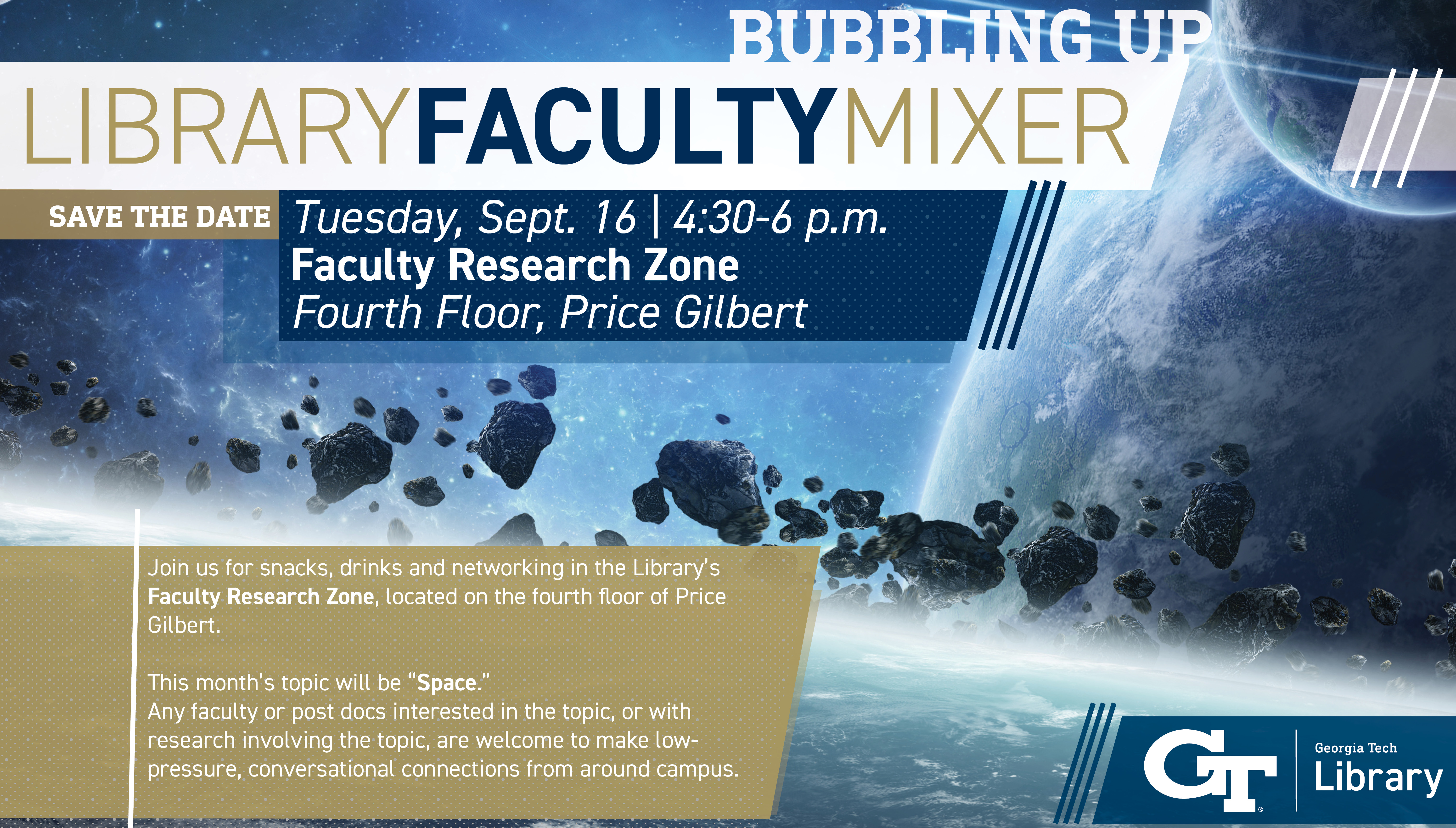 Join the Georgia Tech Library Tuesday, Sept. 16 from 4:30 - 6 p.m. for our “Bubbling Up” faculty mixer, held in Price Gilbert’s fourth floor Faculty Research Zone. This month’s topic is Space.