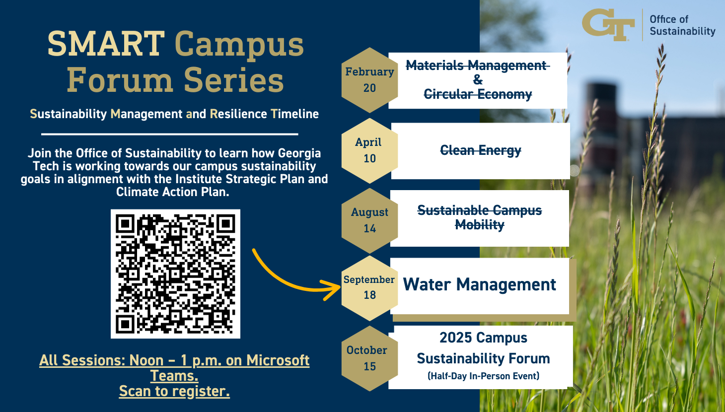 Join the Office of Sustainability for the 2025 SMART Campus Forum Series (Sustainability Management and Resilience Timeline) to learn about campus sustainability initiatives. In alignment with Georgia Tech's Climate Action Plan, the recent Institute Strategic Plan refresh for Foundational Priority 2, and feedback from the 2024 Campus Sustainability Forum, the SMART Campus Forum Series will provide regular progress updates and collect feedback from the campus community on the priority areas below.