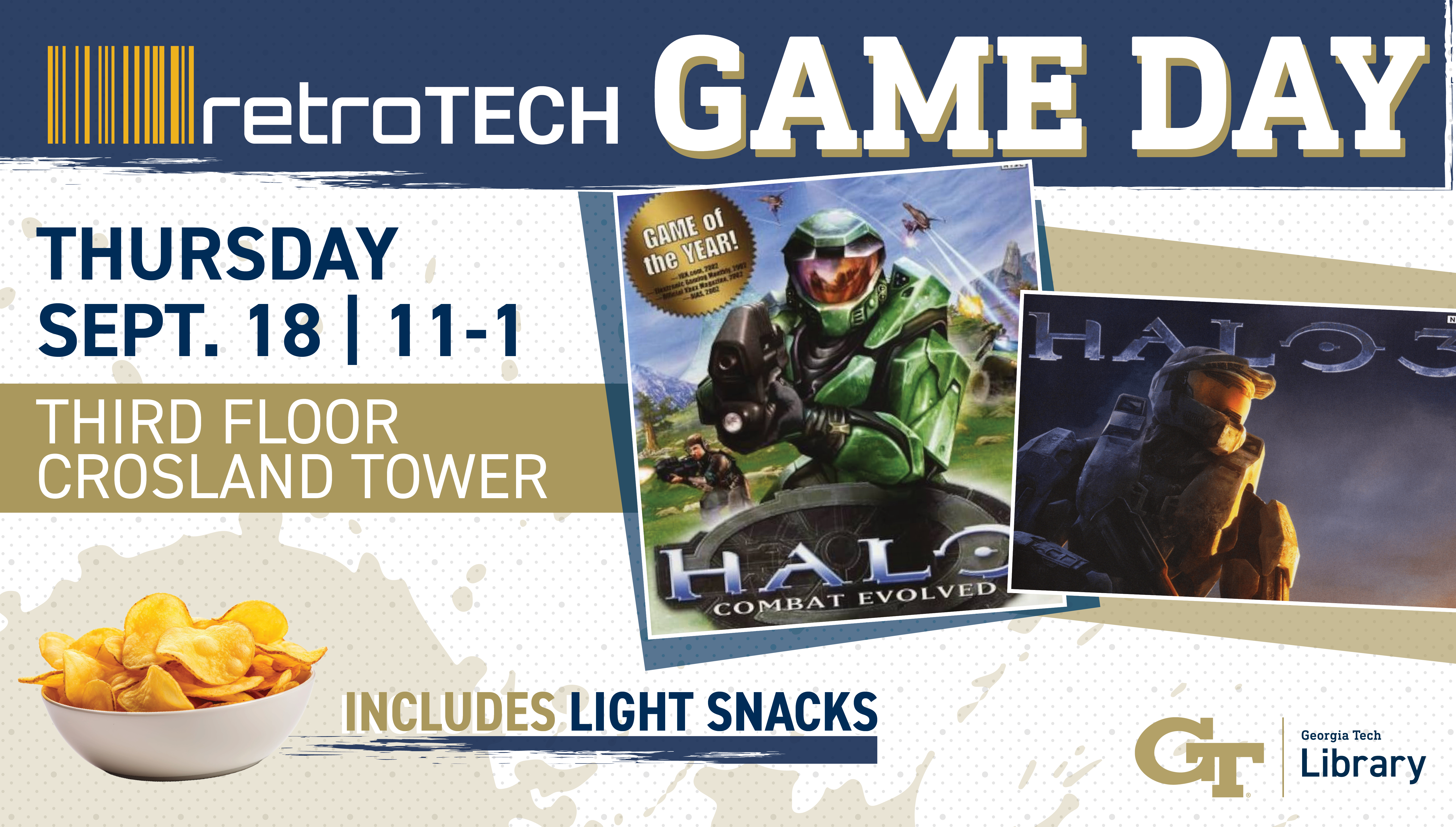 Join the Georgia Tech Library in the retroTECH Lab, located on the third floor of Crosland Tower, Thursday, Sept. 18 from 11 a.m. to 1 p.m. for a Game Day featuring Halo and Halo 3.