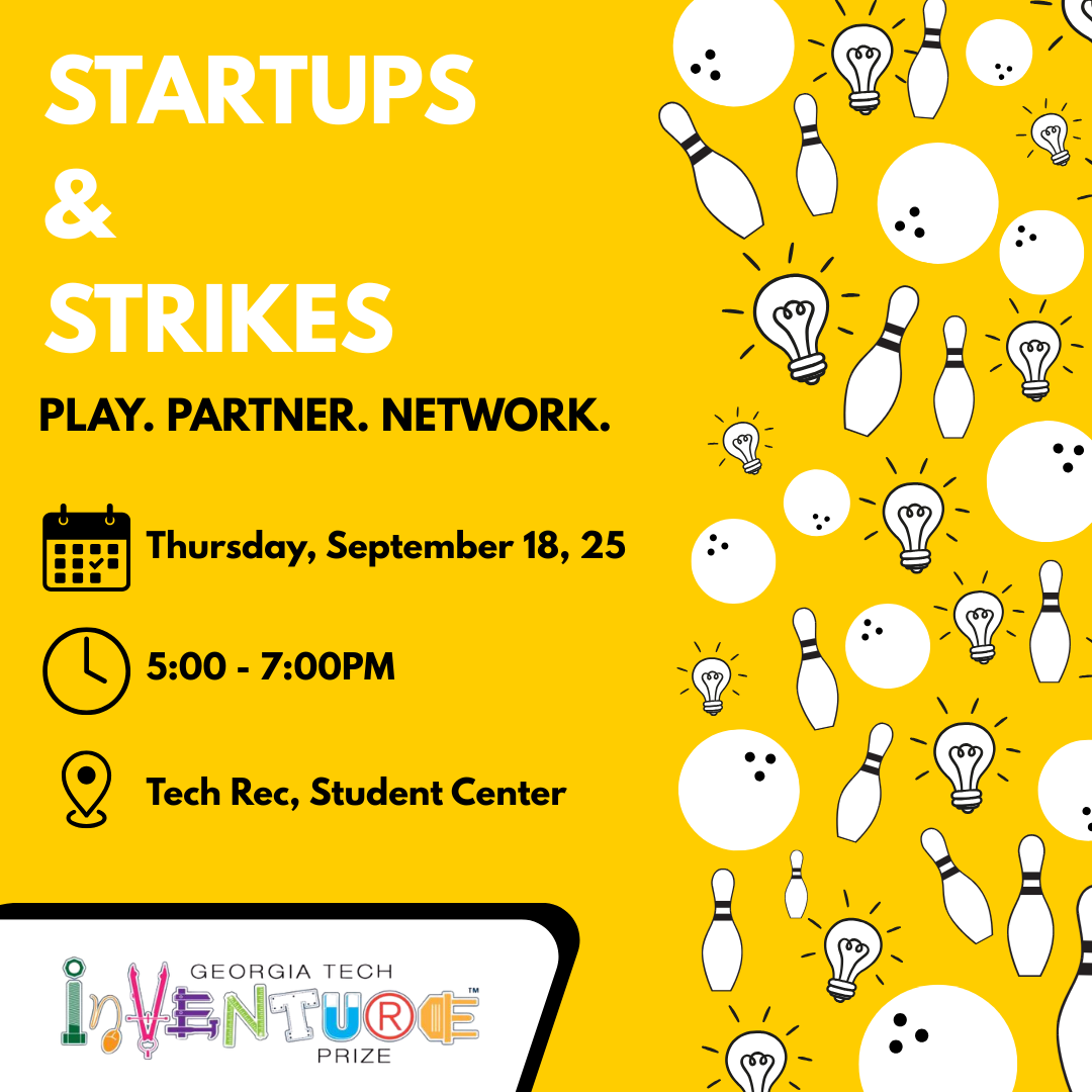 Startups & Strikes Thursday September 18, 2025 5:00PM - 7:00PM Contact Information inventureprize@gatech.edu Location Tech Rec Event time Thu, 09/18/2025 - 17:00 - Thu, 09/18/2025 - 19:00 Startups & Strikes Open to all students, highly encouraged to register as space is limited Related Link Register to Attend Event Categories Free Career/Professional development Conference/Symposium Other/Miscellaneous