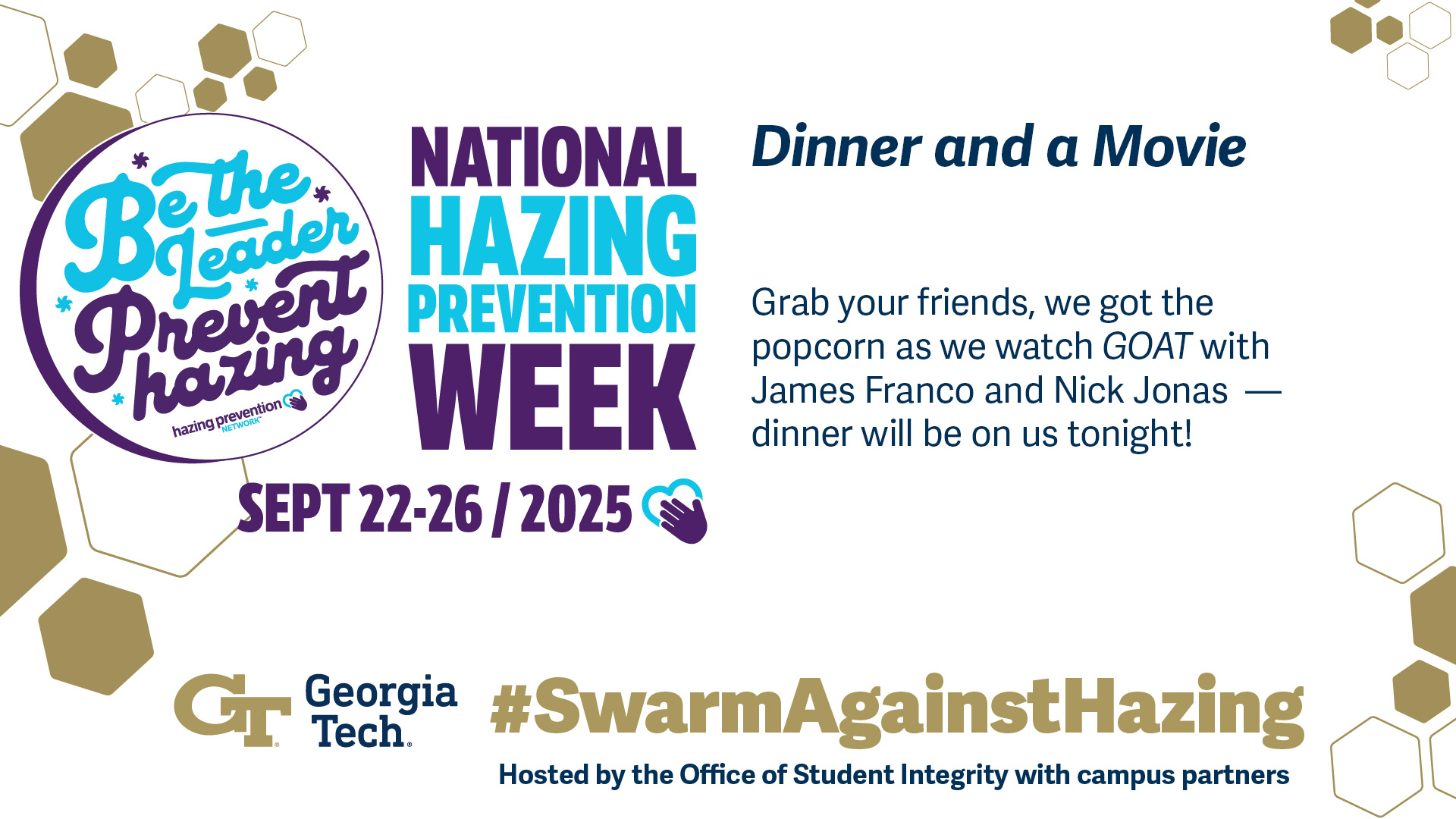 Come right at 5 p.m. for popcorn and to snap a photo with Buzz for our #SwarmAgainstHazing banner!