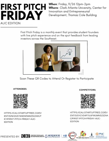 The next First Pitch Friday event will be hosted at the Atlanta University Center on Friday afternoon, September 26.