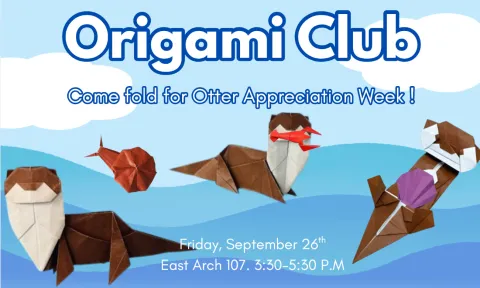 Origami Club Drop-In Weekly Meeting Friday September 26, 2025 3:30PM - 5:30PM Contact Information Dhruv Kulkarni Location East Architecture, Room 107 Event time Fri, 09/26/2025 - 15:30 - Fri, 09/26/2025 - 17:30 Origami Club Drop-In Weekly Meeting Come to Origami Club! We fold origami each week with a different theme. This week, we'll be folding otters and related critters in celebration of Otter Appreciation Week! We will teach you. We are fun. We are free. We are awaiting you. Event Categories Arts and Performance Student sponsored Invited Audiences Faculty/Staff Graduate students Undergraduate students