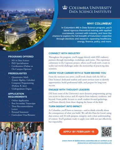 Columbia University's MS in Data Science is more than a degree—it's a launchpad into the future of data and AI. As the flagship program of Columbia’s Data Science Institute, it offers a uniquely immersive experience, connecting students to cutting-edge research, cross-industry partnerships, and a vast interdisciplinary network across the university. Students benefit from tailored career support, one-on-one coaching, and academic advising—gaining the technical depth, flexibility, and perspective to lead in industry, research, or public impact.