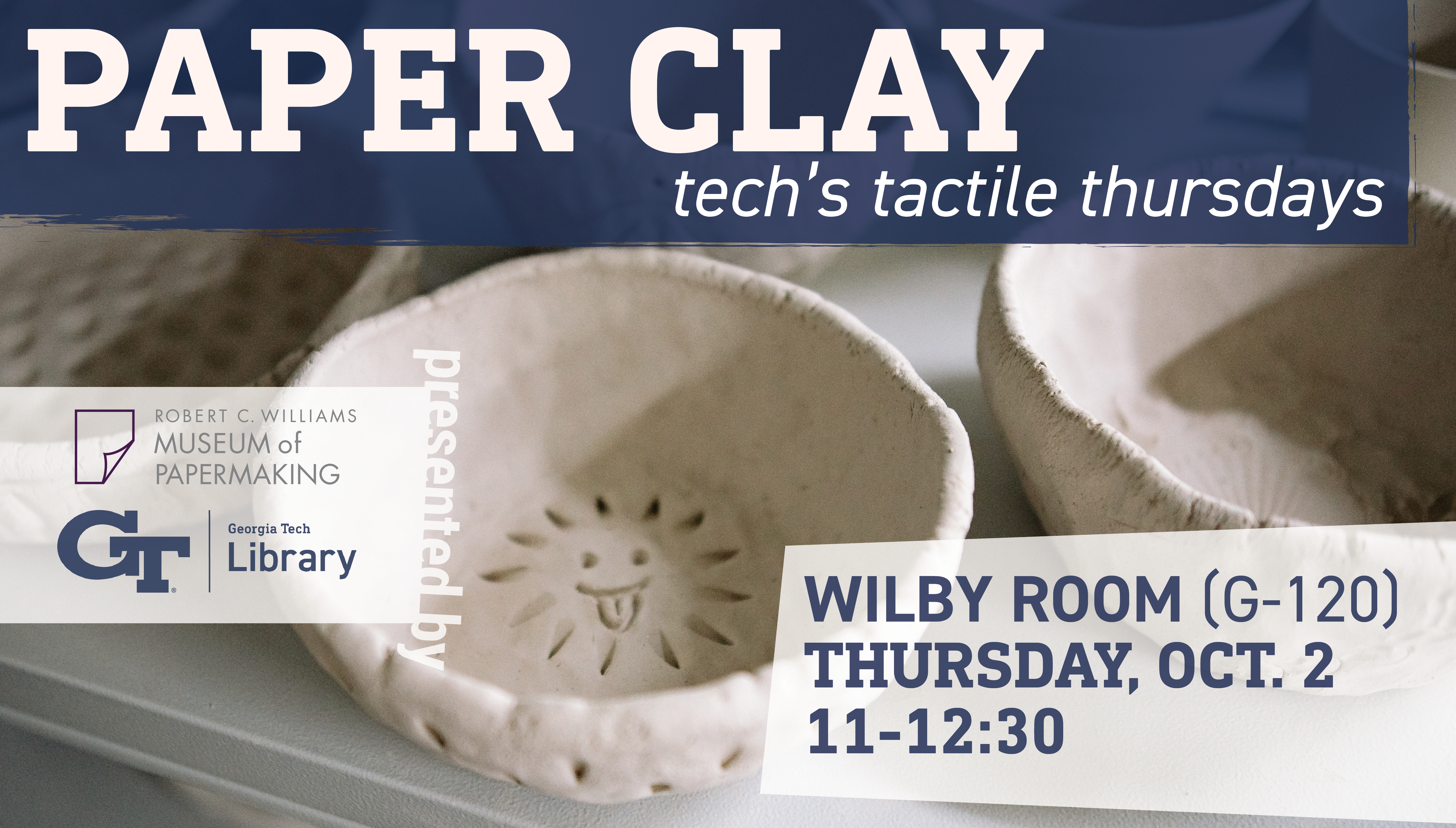Join the Georgia Tech Library in the Wilby Room, located on Grove Level of Crosland Tower, Thursday, Oct. 2 from 11 a.m. to 12:30 p.m. for Tech's Tactile Thursdays: Paperclay.