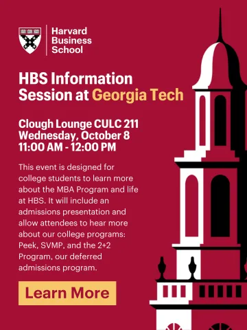 We’ll talk about college student opportunities to engage with HBS now, like Peek into Business Careers, Peek into the MBA, and the Summer Venture in Management Program. You’ll also hear about the HBS 2+2 Program, a deferred admission option for college and master’s students that lets you work for 2–4 years before starting your MBA.