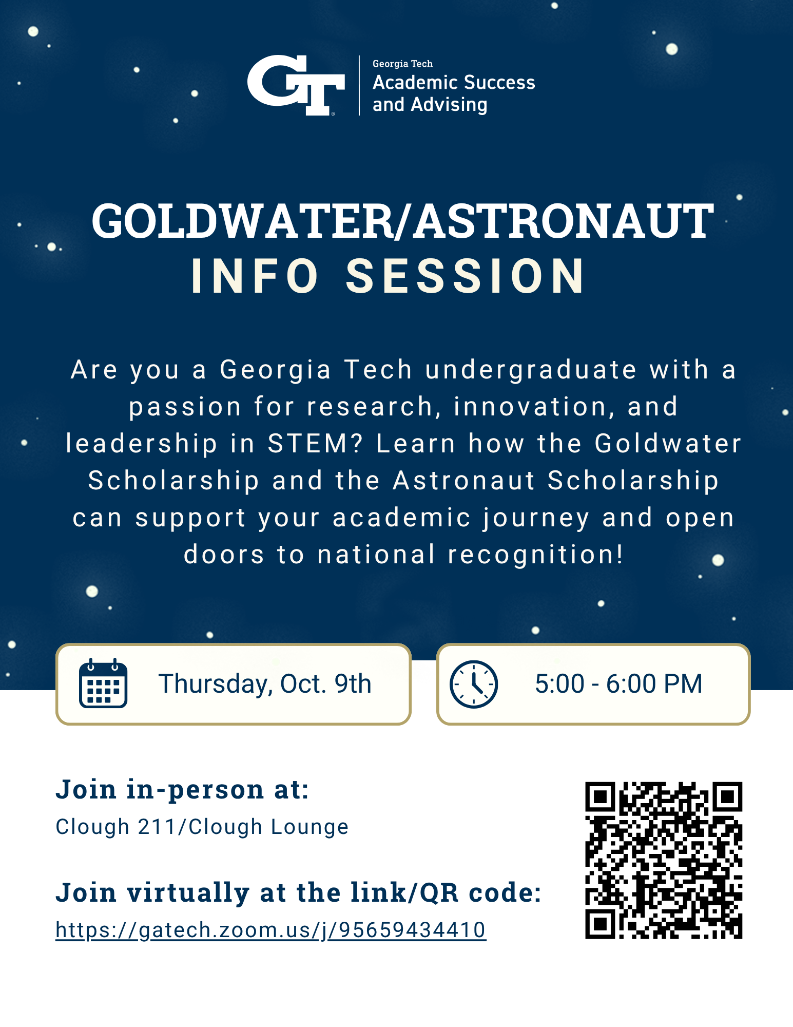 Goldwater/Astronaut Info Session Thursday October 9, 2025 5:00PM - 6:00PM Location Clough 211/Clough Lounge Directions Event time Thu, 10/09/2025 - 17:00 - Thu, 10/09/2025 - 18:00 Goldwater/Astronaut Info Session Are you a Georgia Tech undergraduate with a passion for research, innovation, and leadership in STEM? Learn how the Goldwater Scholarship and the Astronaut Scholarship can support your academic journey and open doors to national recognition! Event Category Workshop Invited Audience Undergraduate students