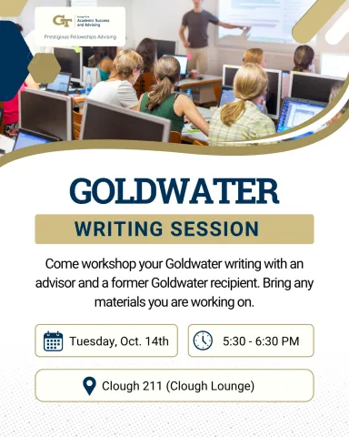 Goldwater Writing Session Tuesday October 14, 2025 5:30PM - 6:30PM Location Clough 211/Clough Lounge Event time Tue, 10/14/2025 - 17:30 - Tue, 10/14/2025 - 18:30 Goldwater Writing Session Come workshop your Goldwater writing with an advisor and a former Goldwater recipient. Bring any materials you are working on. Event Category Workshop Invited Audience Undergraduate students