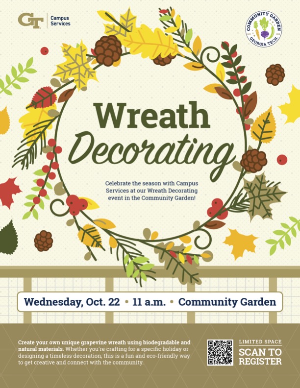 Join Campus Services Sustainability at the Community Garden on Oct. 22 to wreath decorating! Starting at 11 am, create your own unique grapevine wreath using biodegradable and natural materials. Whether you're crafting for a specific holiday or designing a timeless decoration, this is a fun and eco-friendly way to get creative and connect with the community!