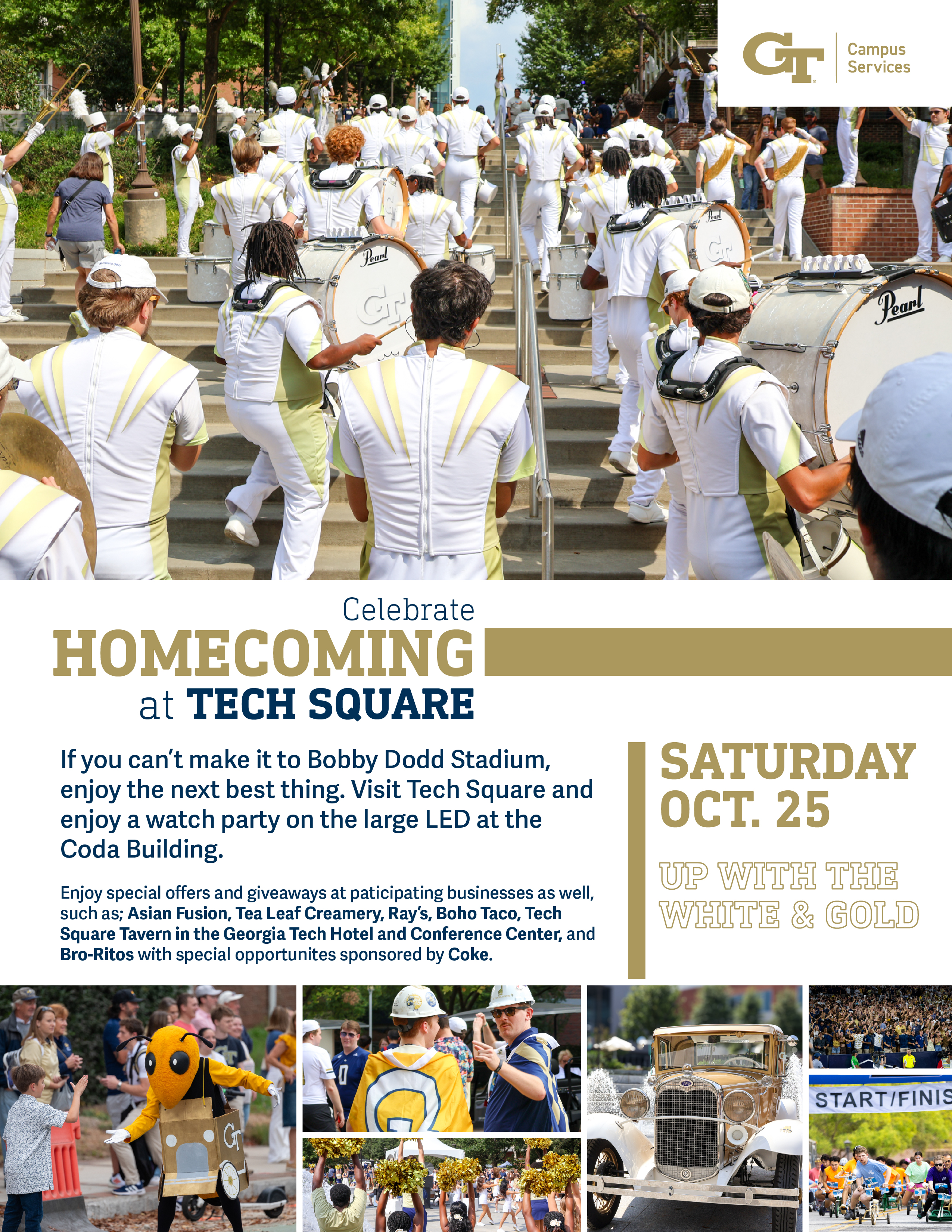 Homecoming is next week and we're excited to bring the excitement to campus! Can't make the football game? Join Campus Services at Tech Square on Saturday, Oct. 25 for a football game watch party at the Coda Building, special offers and giveaways from participating Tech Square retail locations, and more!