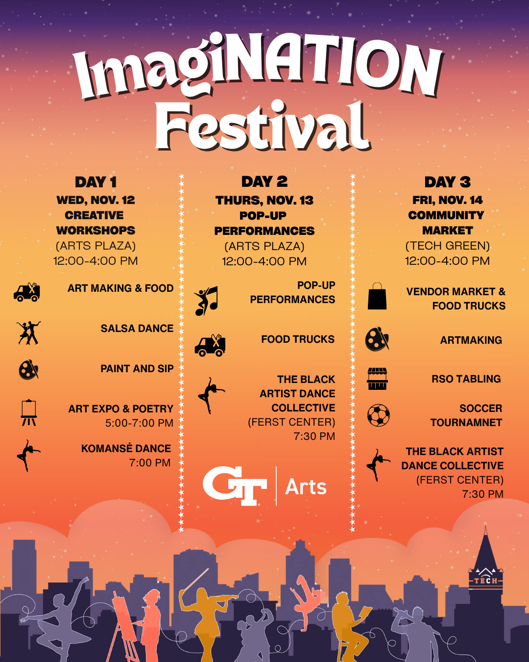 Join GT Arts from November 12–14, 2025 for the first-ever ImagiNATION Festival! The Ferst Center for the Arts, Arts Plaza, and Tech Green will come alive with food, music, dance, and art from around the world. Discover hands-on creative workshops, pop-up performances, a student art exhibition, and a bustling vendor market celebrating culture, identity, and creativity.