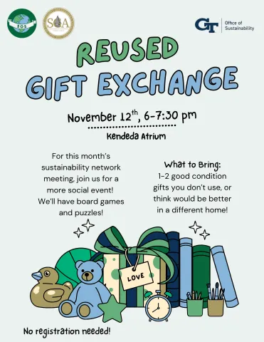 Sustainability Network Social!: Regift Exchange in partnership with Students Organizing for Sustainability and SGA. Bring 1-2 good condition items that need a new home for a pre-holidays gift exchange (no need to wrap!). We’ll have some board games, puzzles, and hot drinks for a cozy early holiday celebration.
