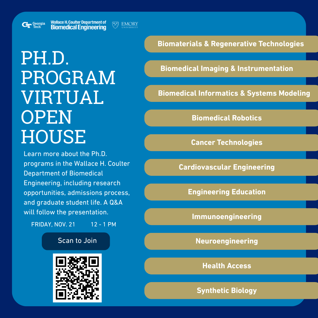 The Wallace H. Coulter Department of Biomedical Engineering invites prospective students to join us for a Ph.D. Program Virtual Open House on Friday, Nov. 21, from 12 - 1 p.m. via Zoom at https://gatech.zoom.us/j/92333997926. , including research opportunities, the admissions process, and graduate student life. A Q&A will follow the presentation, giving attendees the chance to ask questions and learn more about what makes our programs unique.