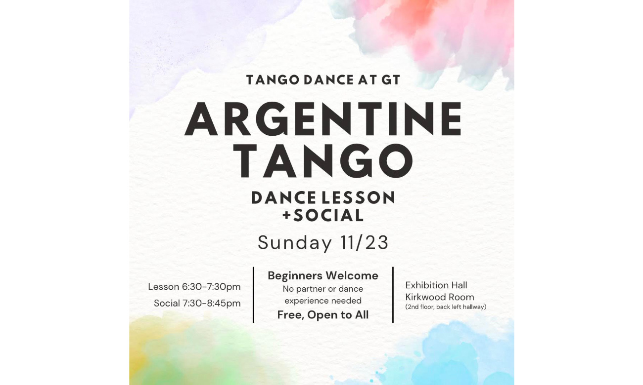 Argentine Tango Beginner Dance Lesson and Social Sunday November 23, 2025 6:30PM - 8:45PM Contact Information Tyler Rhodes Location Exhibition Hall - Kirkwood Event time Sun, 11/23/2025 - 18:30 - Sun, 11/23/2025 - 20:45 Argentine Tango Beginner Dance Lesson and Social Beginners welcome, free and open to all, no partner or dance experience needed. Event Categories Arts and Performance Student sponsored Invited Audiences Faculty/Staff Public Graduate students Undergraduate students