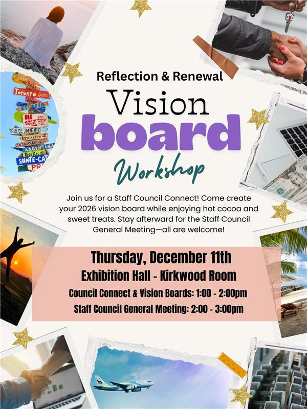 Join us for the Staff Council's December Council Connect, held just before our monthly general meeting. Come create your 2026 vision board while enjoying hot cocoa and sweet treats.