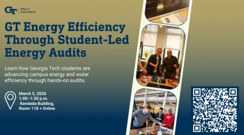 GT Energy Efficiency Through Student-Led Energy Audits features Georgia Tech students Shivangi Ranjan and Calina Levy as they share their current efforts to improve building efficiency on campus. Building on findings from their Fall 2025 VIP course taught by Jennifer Chirico and Jairo Garcia, the students are working to implement opportunities identified in class to reduce energy and water use across four campus buildings. Shivangi and Calina are now actively collaborating with the Office of Sustainability to advance these recommendations as part of ongoing campus sustainability initiatives outlined in the Georgia Tech Climate Action and Sustainability NEXT plans.